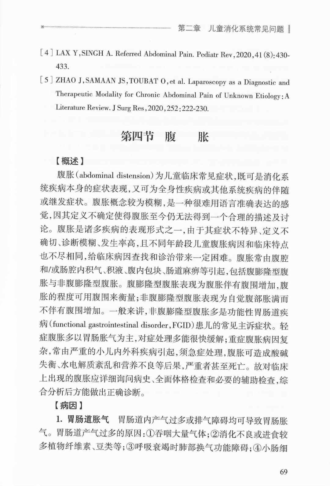 ● 腹胀(abdominal distension)为儿童临床常见症状,既可是消化系统疾病本身的症状表现,又可为全身性疾病或其他系统疾病的伴随或继发症。腹胀常由腹腔和/或肠腔内积气、积液、腹内包块、肠道麻痹等引起,包括腹膨隆型腹胀与非腹膨隆型腹胀。轻症腹胀多以胃肠胀气为主,对症处理多能很快缓解;重症腹胀病因复杂,常由严重的小儿内外科疾病引起,须急症处理,腹胀可造成酸碱失衡、水电解质紊乱和营养不良等后果,严重者甚至死亡。故对临床上出现的腹胀应详细询问病史、全面体格检查和必要的辅助检查,综合分析后方能做出正确诊断。