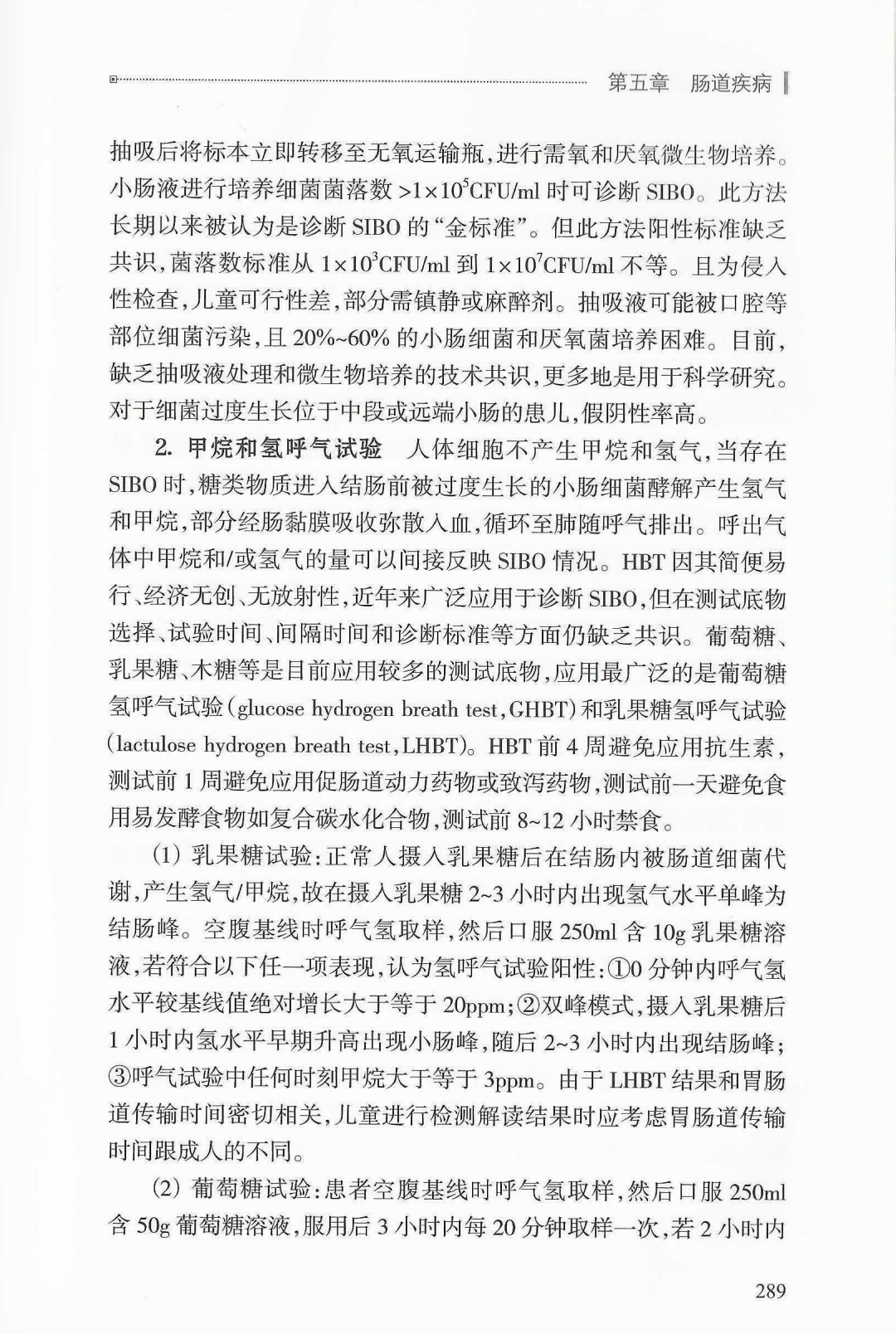 ● 氢气呼气试验(breath hydrogen testing, BTH):氢气呼气试验的原理是未分解乳糖在肠道可以产生一定量的氢气吸收入血后随肺排出,测定呼出氢气的水平可以间接反映乳糖的消化吸收状况。方法:口服1~2g/kg 乳糖,3 小时后测定呼气中氢气浓度,与空腹水平比较,升高> 2×105mol/L (ppm)判定为吸收不良。