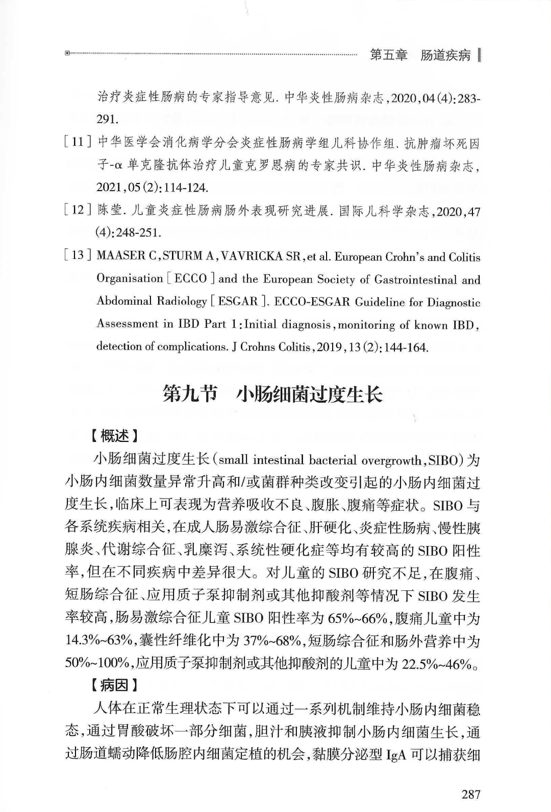 ● 小肠细菌过度生长(small intestinal bacteria overgrowth, SIBO)为小肠内细菌数量异常升高/或菌群种类改变引起的小肠内细菌过度生长,临床上可表现为营养吸收不良、腹胀、腹痛等症状。SIBO与各系统疾病相关,在成人肠易激综合征、肝硬化、炎症性肠病、慢性胰腺炎、代谢综合征、乳糜泻、系统硬化症等均有较高的SIBO阳性率,但在不同疾病中差异很大。对儿童的SIBO研究不足,在腹痛、短肠综合征、应用质子泵抑制剂或其他抑酸剂等情况下SIBO发生率较高,肠易激综合征儿童SIBO阳性率为65%~66%,腹痛儿童中为14.3%~63%,囊纤维化中为37%~68%,短肠综合征和肠外营养中为50%~100%,应用质子泵抑制剂或其他抑酸剂的儿童中为22.5%~46%。