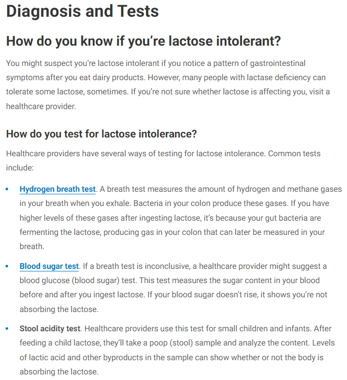 呼气试验:如果你在摄入乳糖后氢气、甲烷含量更高,那是因为你的肠道细菌正在发酵乳糖,在结肠中产生气体,这些气体稍后可以在你的呼气中被测量到。