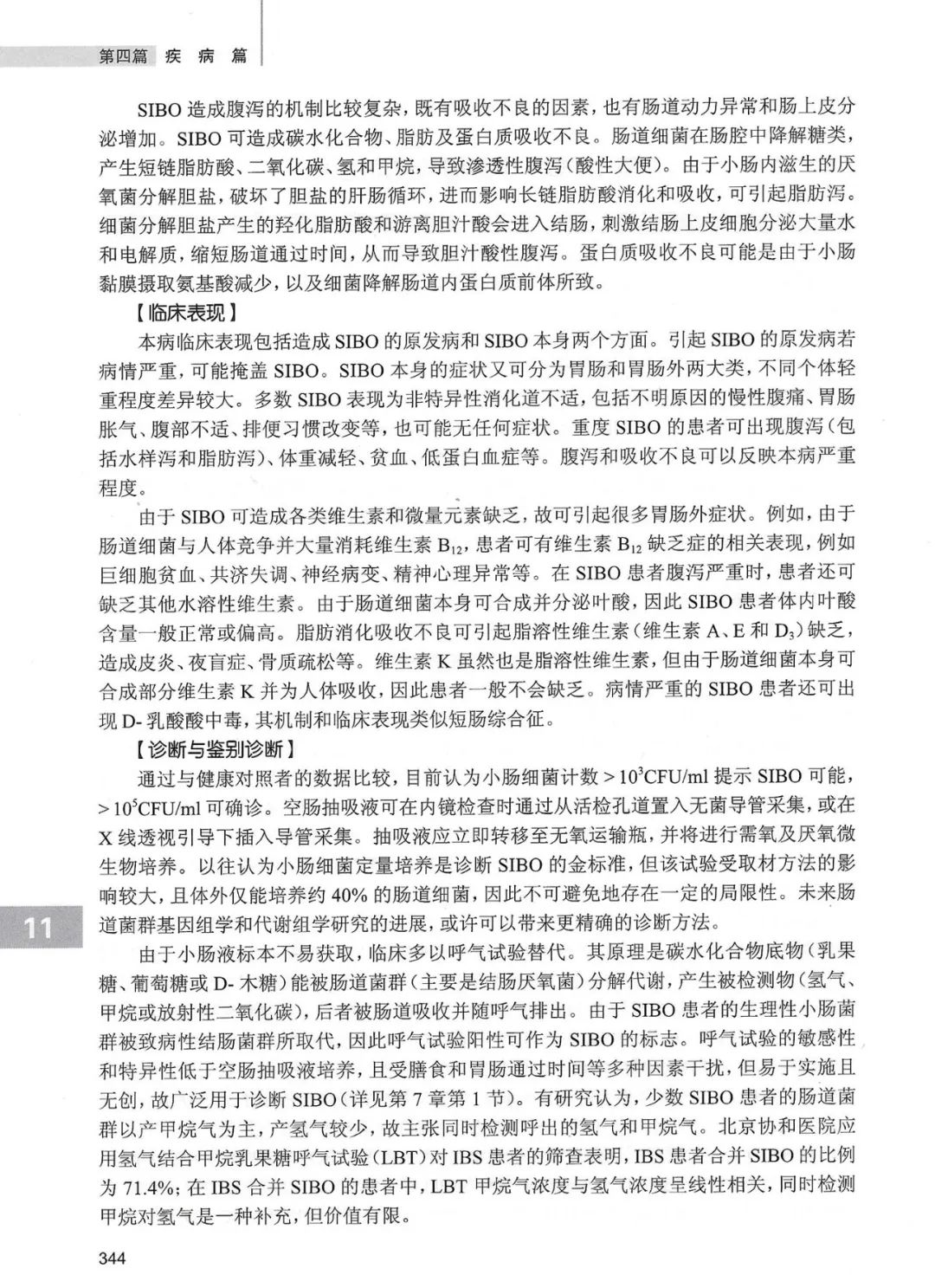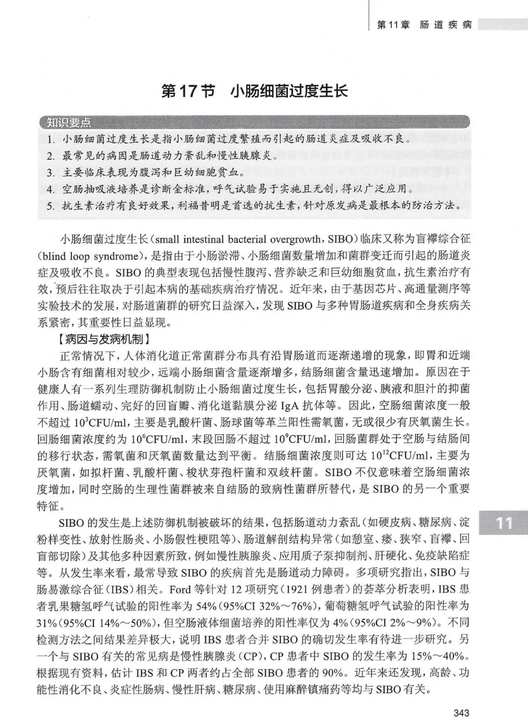 ● 小肠细菌过度生长(SIBO),临床又称为盲襻综合征(blind loop syndrome),是指由于小肠淤滞、小肠细菌数量增加和菌群变迁而引起的肠道炎症及吸收不良。SIBO的典型表现包括慢性腹泻、营养缺乏和巨幼细胞贫血,抗生素治疗有效,预后往往取决于引起本病的基础疾病治疗情况。近年来,由于基因芯片、高通量测序等实验技术的发展,对肠道菌群的研究日益深入,发现SIBO与多种胃肠道疾病和全身疾病关系紧密,其重要性日益显现。