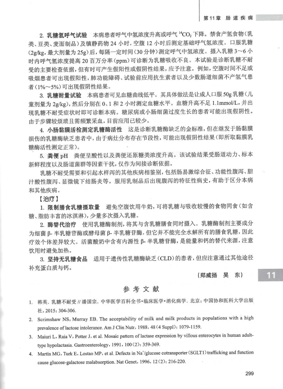 ● 乳糖氢呼气试验:本病患者呼气中氢浓度升高或呼气14CO2下降。禁食产氢食物(乳类、豆类、麦面制品)及镇静药物24小时,空腹12小时后测定基础呼气氢浓度。口服乳糖(2g/kg,最大剂量为25g)后,每隔一定时间(30分钟)测定呼气中氢浓度。摄入乳糖3~6小时内呼气氢浓度提高20百万分率(ppm)可诊断为乳糖吸收不良。本试验是诊断乳糖不耐受的主要检查依据,但有时可产生假阳性或假阴性结果,应予注意。例如,空腹时间不足或吸烟患者可出现假阳性,肺功能障碍、试验前应用抗生素者以及少数肠道细菌不产氢气患者(1%~5%)可出现假阴性结果。
