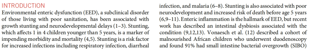 环境性肠功能障碍(EED)是一种亚临床综合征,主要发生在卫生条件差的人群中,与生长发育迟缓和神经发育迟缓有关。发育迟缓影响着四分之一的5岁以下儿童,是即将发病和死亡的标志。发育迟缓也是增加感染的危险因素,包括呼吸道感染、腹泻感染和疟疾,且与神经发育不良和5岁前死亡风险增加有关。