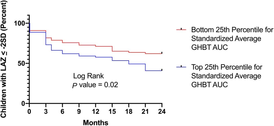 (1)标准化平均GHBT面积(AUC)与年龄别身长(LAZ)得分呈负相关;