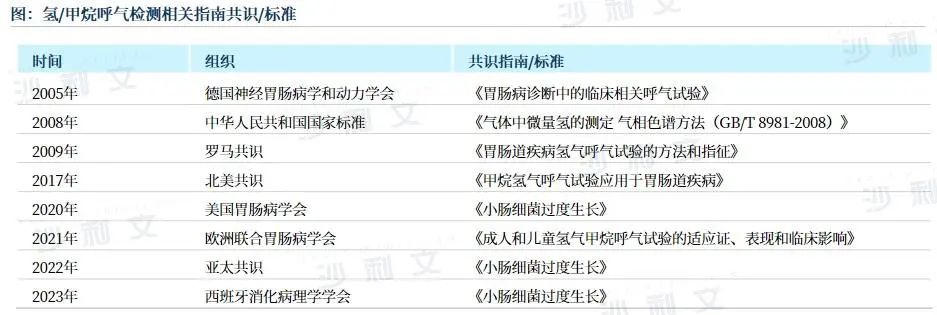 2005年,《胃肠病诊断中的临床相关呼气试验》首次于国家级专业学会上,针对采用氢呼气试验诊断碳水化合物吸收不良及SIBO提出了建议,并详细给出了试验准备及检测流程的相关指导。2008年,中华人民共和国国家标准《气体中微量氢的测定气相色谱方法(GB/T 8981-2008)》要求,气相色谱法是测量氢气的标准方法,并可用于医学领域。2009年,有关氢气呼气试验的第一个临床专家共识问世,《罗马共识》指出,固定式气相色谱仪代表了氢气呼气试验的“金标准”。2017年发布的《北美共识》是另一个具有重要意义的国际共识,该共识首次将呼气甲烷检测纳入呼气试验中,提出了采用氢和甲烷呼气试验的方法,并建议使用二氧化碳作为校正参考,以确保数据的可靠性。2020年在《北美共识》的基础上的《小肠细菌过度生长》,是首次由美国胃肠学会发表的采用氢和甲烷呼气试验诊断SIBO的临床指南,并正式提出产甲烷菌过度生长(IMO)的概念。自2020年开始,国际组织连续四年发布关于氢/甲烷呼气试验的临床指南,不断更新对氢/甲烷呼气检测应用于SIBO、LNP、OCTT等多种疾病的见解,涉及临床表现、鉴别诊断、治疗措施等。