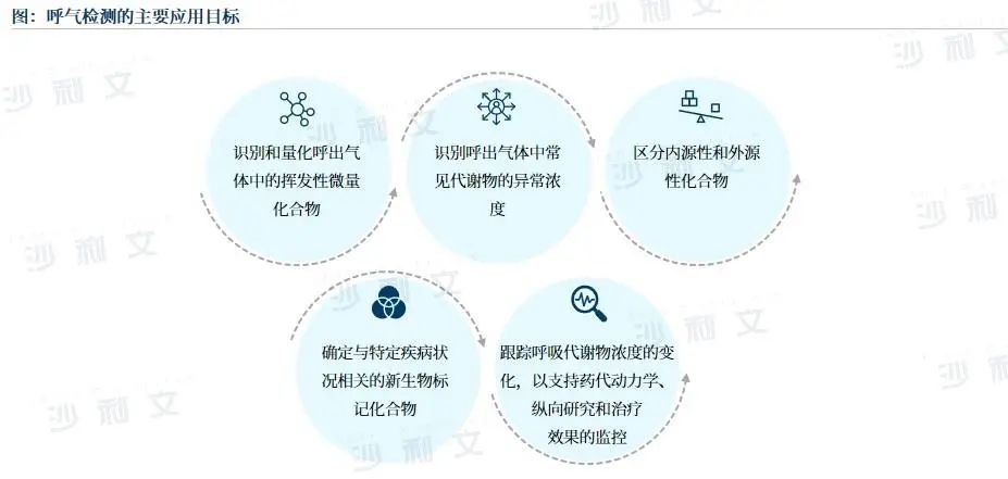 近年来,呼出气中气体的种类及含量的变化被发现与多种疾病存在关联,并逐步推进至临床应用中,如在胃肠疾病诊断、幽门螺杆菌检测。呼气检测技术对呼气成分进行直接测定或测定摄入特定化合物后呼气中的标志性气体,从而实现人体的健康状况评估和疾病诊断,其主要的应用目标包括以下几种: