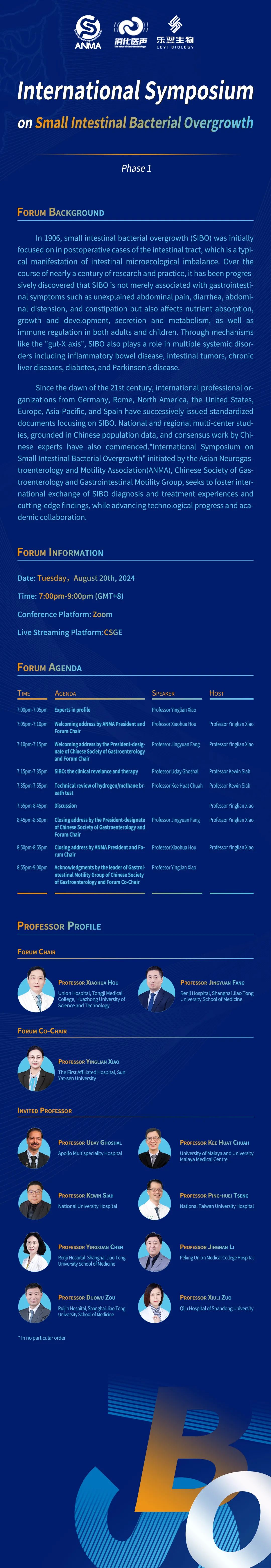 2024年08月20日,由亚洲神经胃肠病和动力学学会(ANMA)发起的『小肠细菌过度生长国际专家研讨论坛』即将隆重召开。本次论坛汇集了国内外消化领域的顶尖专家学者,通过学术报告、研讨交流等多种形式,分享小肠细菌过度生长(SIBO)诊疗经验,探讨SIBO前沿成果,旨在加强国际学术交流与合作,助推消化医学事业高质量发展。