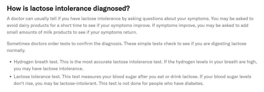 医生会安排检查以确认诊断。这些简单的测试可以检查您是否能正常消化乳糖。