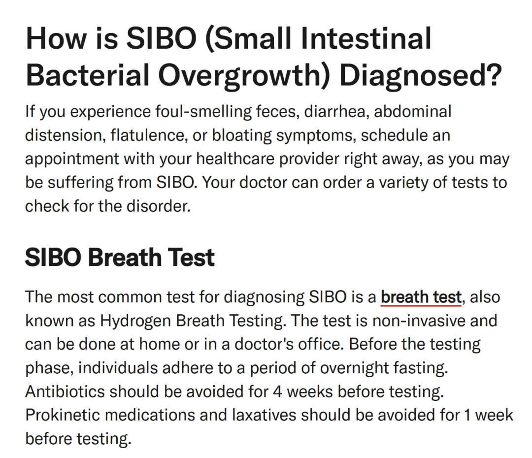 呼气试验。诊断SIBO最常见的方法是呼气试验,也称为氢气呼气试验。这种测试是非侵入性的,可以在家里或在医生诊室里进行。测试前需要禁食一段时间;测试前4周内应避免使用抗生素;测试前1周内应避免服用促动力药物和泻药。