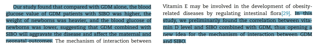 ▌ GDM患者SIBO发生率高,SIBO可能通过影响炎症反应、维生素水平等,进一步促使患者血糖升高,最终影响母亲的病情发展及新生儿的健康状况。