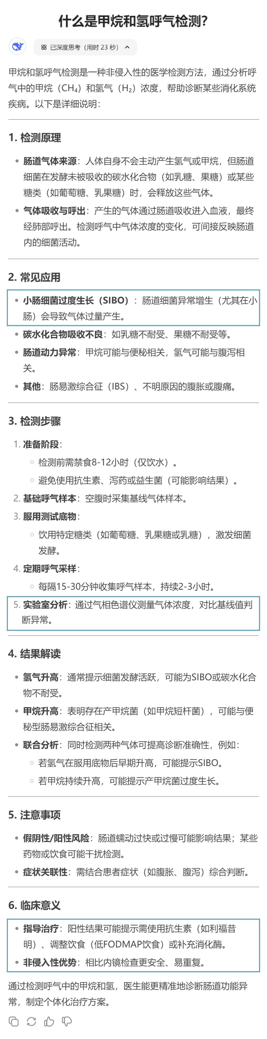 今天,我们尝试与DeepSeek展开专业对话,探讨消化系统疾病诊断的前沿技术——甲烷和氢呼气检测,以下为DeepSeek的专业解答: