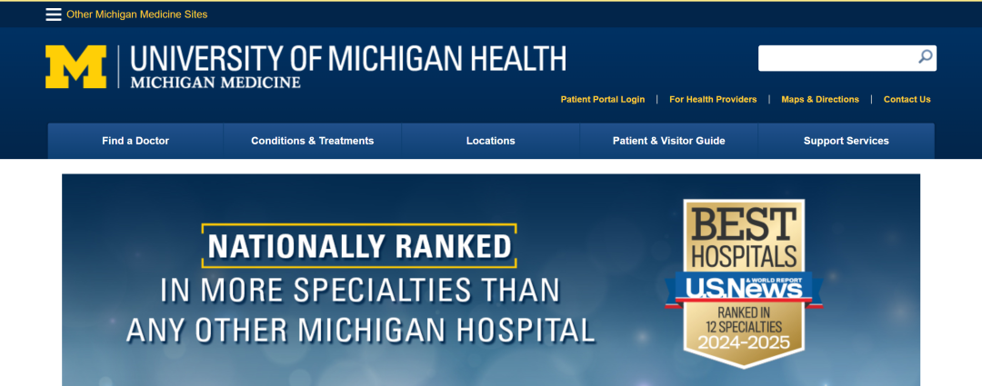 密歇根大学医院(University of Michigan Health-Michigan Medicine),坐落于密歇根州的安阿伯,始建于1850年,是一所教学性质的综合医院。该医院在2024-2025年度被评为美国最佳医院之一。密歇根大学医院的使命是通过科学发现创建医疗保健的未来,并成为医疗保健、生物医学创新和教育领域的领导者。