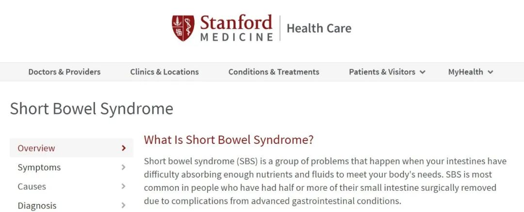 短肠综合征(SBS)是指是因肠道无法正常吸收足够营养,而引发的临床症候群。该病症最常见于因严重胃肠道疾病并发症而手术切除一半或更多小肠的患者。
