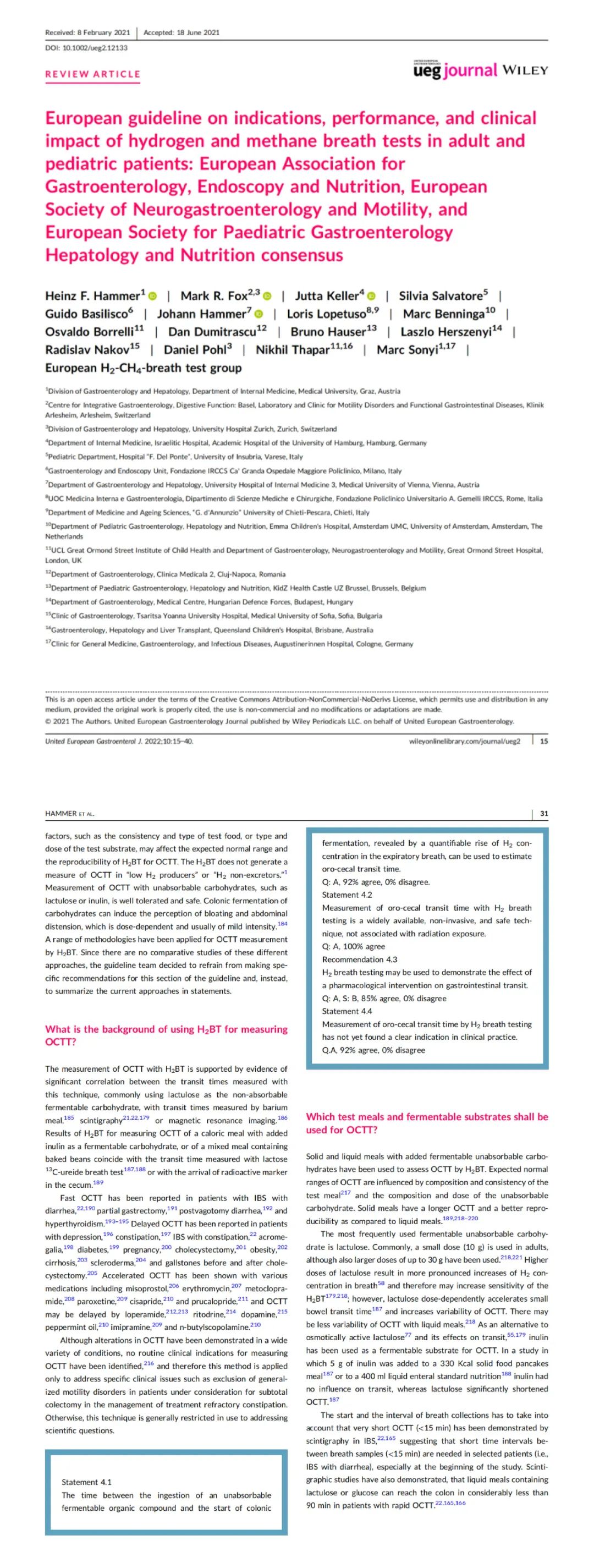 Hammer HF, Fox MR, Keller J, et al. European guideline on indications, performance, and clinical impact of hydrogen and methane breath tests in adult and pediatric patients: European Association for Gastroenterology, Endoscopy and Nutrition, European Society of Neurogastroenterology and Motility, and European Society for Paediatric Gastroenterology Hepatology and Nutrition consensus. United European Gastroenterol J. 2022;10(1):15-40. doi:10.1002/ueg2.12133