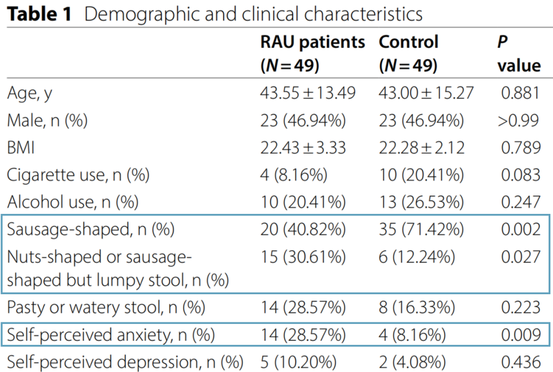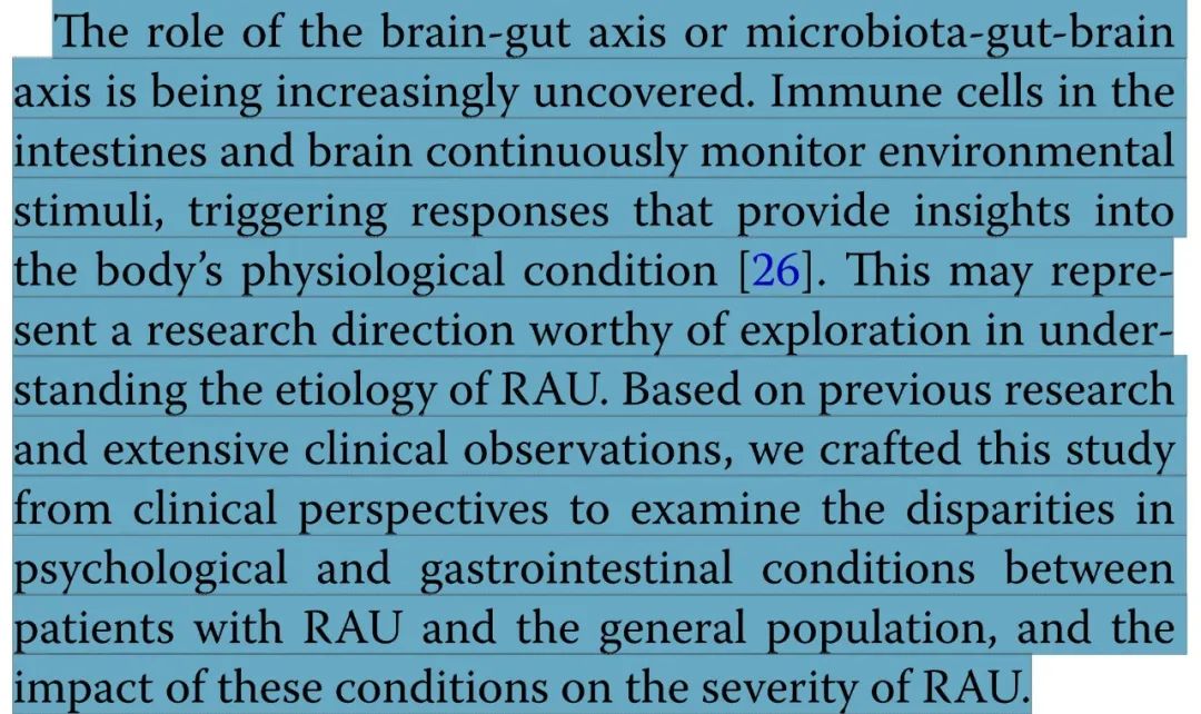 近年来,脑-肠轴的作用机制日益明晰。肠道与大脑中的免疫细胞通过持续监测环境刺激,其应答反应可反馈出机体的生理状态。这一发现为探索RAU的病因学机制提供了新的研究方向。基于前期研究成果与大量临床实证,本研究从临床视角出发,旨在系统比较RAU患者与健康人群在心理状态和胃肠功能方面的差异性特征,并深入探究这些因素对RAU病情严重程度的影响机制。