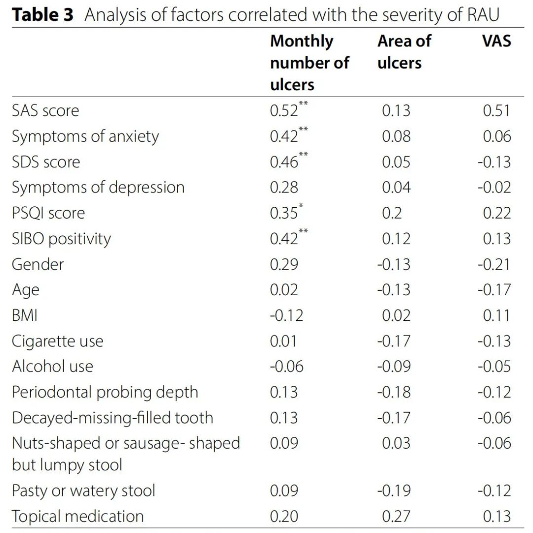 通过相关性分析评估RAU严重程度与各影响因素的关系发现:患者每月溃疡发生频次与以下指标呈显著正相关——SAS评分、是否存在焦虑症状、抑郁自评量表(SDS)评分、匹兹堡睡眠质量指数(PSQI)评分以及SIBO阳性。