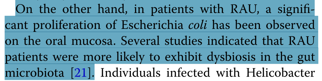 另一方面,在RAU患者中可观察到口腔黏膜大肠埃希菌的显著增殖。多项研究指出RAU患者更易出现肠道菌群失调,其菌群构成与健康人群存在明显差异,表现为益生菌减少而条件致病菌过度生长。