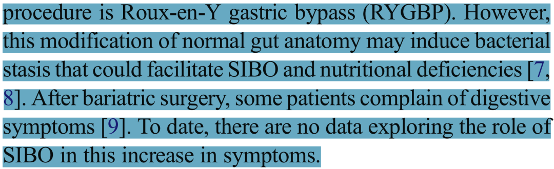 目前唯一被认为能实现长期有效减重的治疗方法是减重手术,其中最有效的术式为Roux-en-Y胃旁路术(RYGBP)。然而,该手术会改变正常的肠道解剖结构,可能导致细菌淤滞,从而诱发SIBO和营养缺乏。一些患者在接受减重手术后出现消化道症状。目前尚无研究探讨SIBO在这些术后症状增加中的潜在作用。