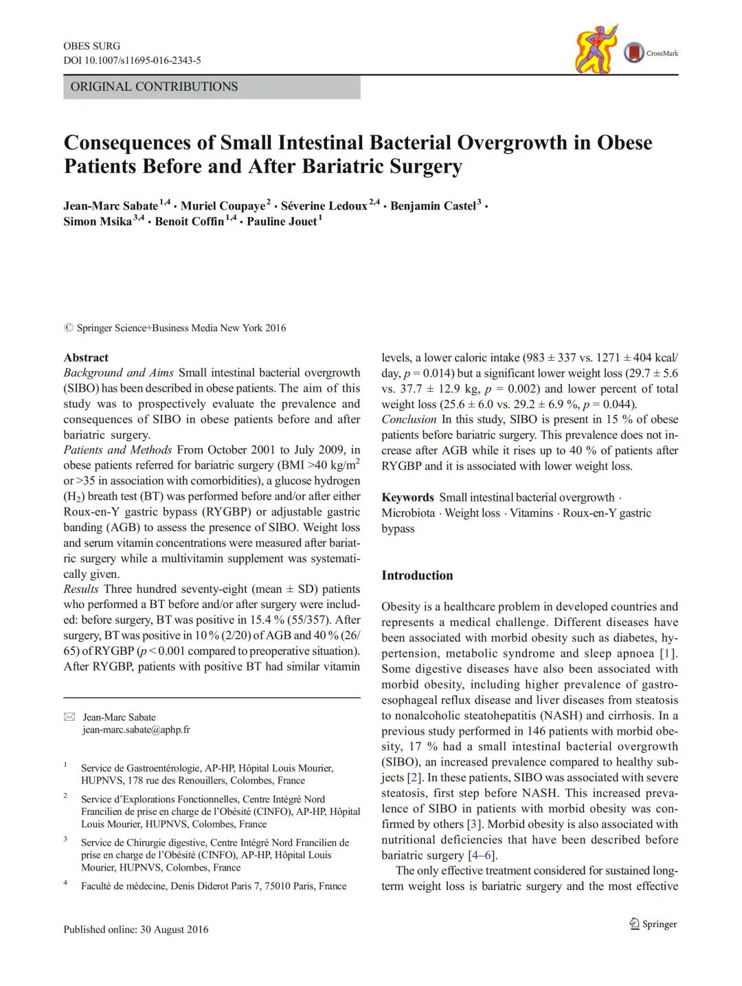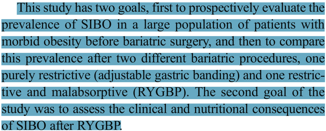 本研究目的在于:首先是前瞻性评估一大批病态肥胖患者在减重手术前的SIBO患病率,随后比较两种不同术式后的SIBO患病率——一种是单纯限制摄食的可调节胃束带术(AGB),另一种是兼具限制摄食和吸收的RYGBP术;其次是评估RYGBP术后SIBO的临床与营养学后果。