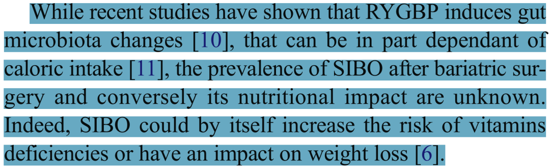 尽管近期研究表明,RYGBP术会引起肠道菌群的改变,且这种变化在一定程度上可能取决于热量摄入,但术后SIBO的患病率及其对营养状况的影响仍不明确。事实上,SIBO本身可能增加维生素缺乏的风险,甚至对体重减轻效果产生影响。