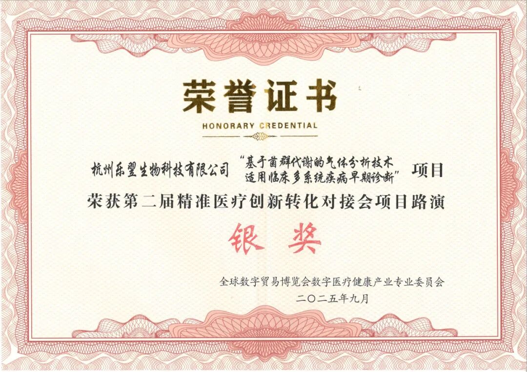 09月25-29日,第四届全球数字贸易博览会(简称“数贸会”)在杭州大会展中心盛大举行。作为数贸会重要产业活动之一,在26日下午举办的第二届精准医疗创新转化对接会上,乐翌生物凭借突出的技术创新实力与临床转化潜力,从众多优秀路演项目中脱颖而出,成功斩获“银奖”殊荣。