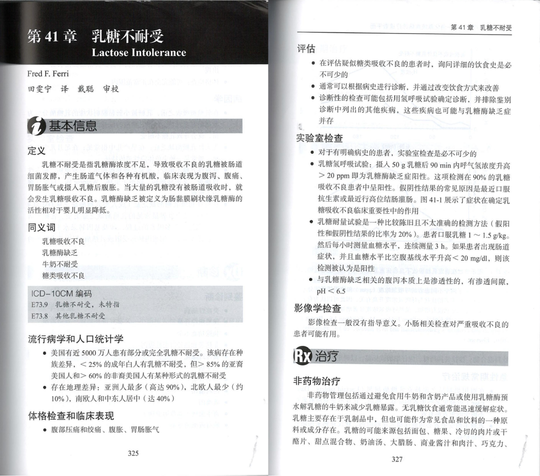 · 诊断性的检查包括用氢呼气试验确定诊断,并排除鉴别诊断中列出的其他疾病,这些疾病也可能与乳糖酶缺乏症并存。