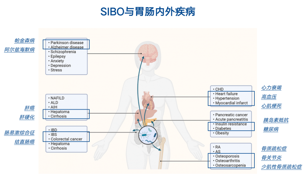 更值得关注的是,SIBO与帕金森病、肝硬化、IBS、结直肠息肉、心力衰竭、糖尿病、骨质疏松等多种老年常见疾病密切相关,严重影响生活质量且与不良预后相关。针对SIBO/IMO的治疗可有效改善患者的症状。