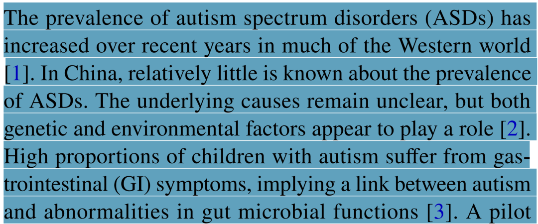 近年来,在多数西方国家,自闭症谱系障碍(ASD,以下简称自闭症)的患病率呈上升趋势。然而,我国对ASD患病率的了解仍相对有限。ASD的病因尚未明确,遗传与环境因素可能共同参与其发病过程。大量自闭症患儿伴有胃肠道症状,提示自闭症可能与肠道微生物功能异常存在关联。一项先导研究指出,肠道菌群可能通过“肠-脑轴”机制参与自闭症的发病。