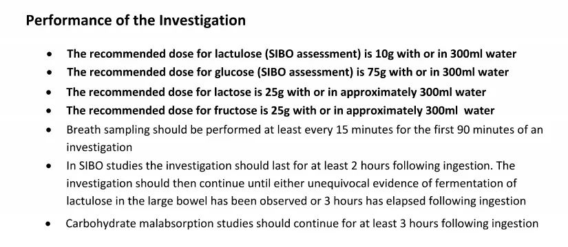 在SIBO研究中,检测应在摄入乳果糖后持续至少2小时,直到观察到大肠中乳果糖发酵的明确证据或摄入后3小时。