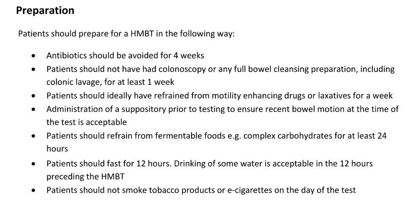 患者应禁食12小时,在HMBT前12小时内可以喝一些水。 -