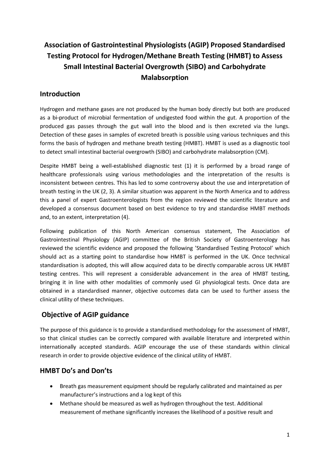 本指南的目的是为甲烷和氢呼气试验(HMBT)的评估提供一个标准化的方法,以便临床研究可以与现有文献进行正确的比较,并在国际公认的标准内进行解释。胃肠道生理学家协会(AGIP)鼓励在临床研究中使用这些标准,以便为HMBT的临床应用提供客观证据。