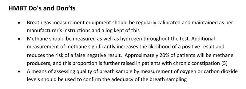 在整个检测过程中,应同时测量甲烷和氢气。检测甲烷显著增加了阳性结果的可能性并且减少假阴性的风险。大约有20%的患者会产生甲烷,而慢性便秘患者的这一比例会更高。 -
