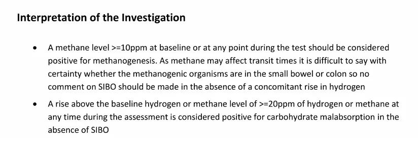 在基线或测试期间的任何点,甲烷水平>=10ppm应被视为阳性。由于甲烷可能会影响(口腔-盲肠)运输时间,因此很难确定产甲烷细菌是否在小肠或结肠中,因此在没有伴随氢气增加的情况下,无法确认是否患有SIBO。