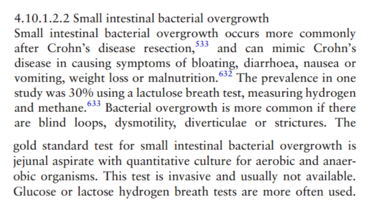 小肠细菌过度生长常发生在克罗恩病术后,引起类似克罗恩病的症状,如腹胀、腹泻、恶心或呕吐、体重减轻或营养不良。一项研究使用乳果糖呼气试验,测量克罗恩病患者呼出气体中氢和甲烷的浓度,发现小肠细菌过度生长发病率为30%。如果克罗恩病患者有小肠盲袢、运动障碍、憩室或狭窄等症状则更容易发生小肠细菌过度生长。
